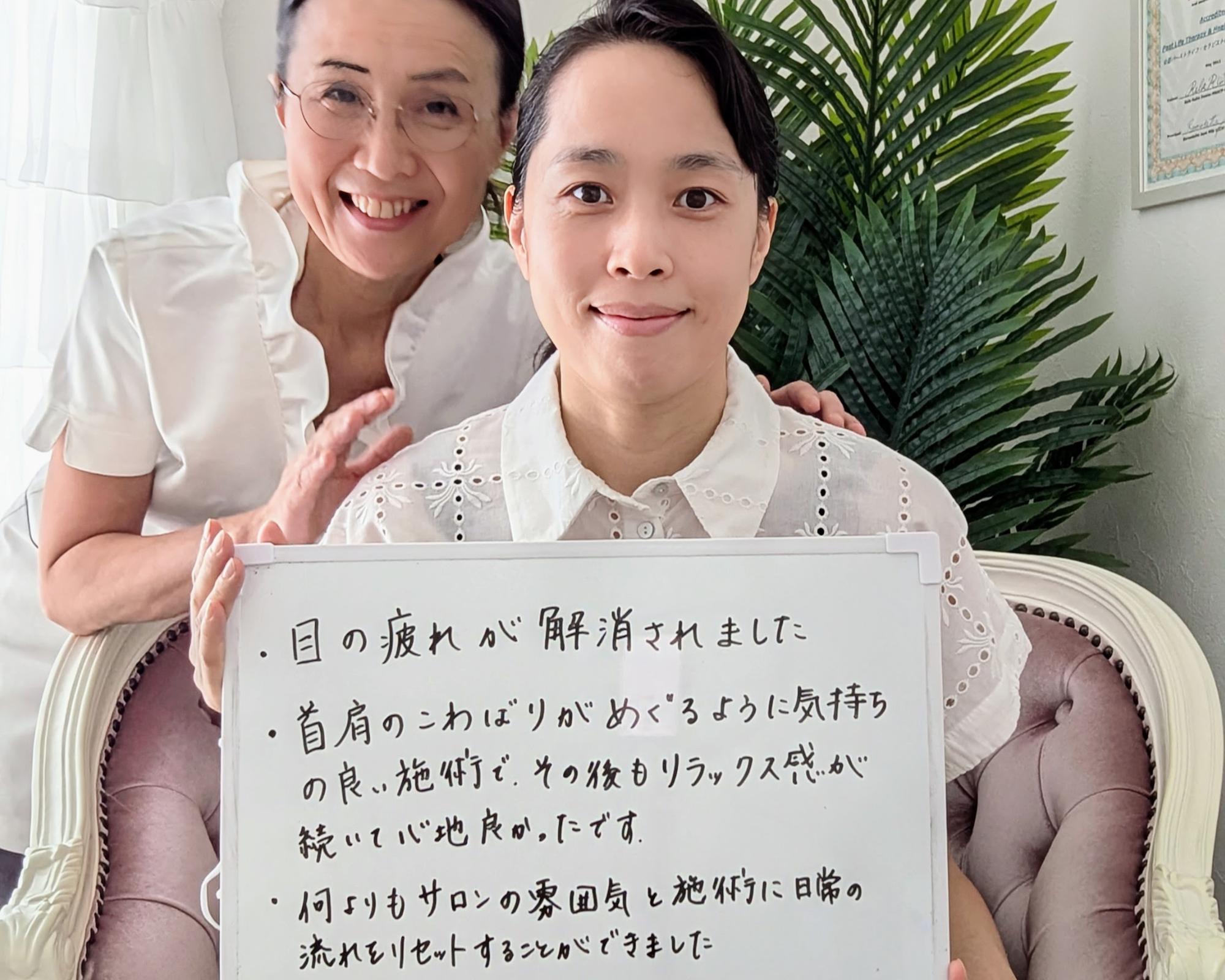 お顔を優しくなでるように触っていただいていると、血流が良くなり、体が温かくなってきました。肌に触れる手の感触ももちもちして気持ちが良いです。首や肩もちょうど良い力でしていただき、とてもほぐれてスッキリしました。